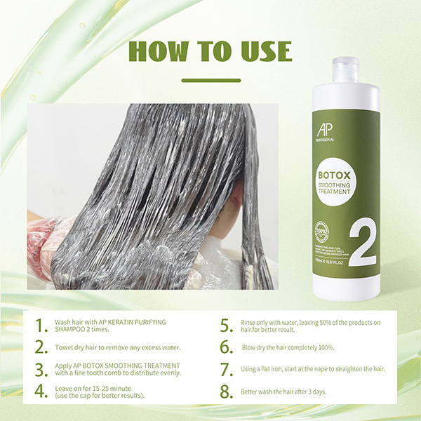 AP BOTOLISS SMOOTHING TREATMENT No.2 is a safely smoothing treatment. This revolutionary no formaldehyde smoothing system infuses unique amino acids, keratin and Argan oil into hair' s cuticle. The process safely turns frizzy, curly hair into straight, soft and shine, yet lasts for long time when combined with heat from iron and dryer.