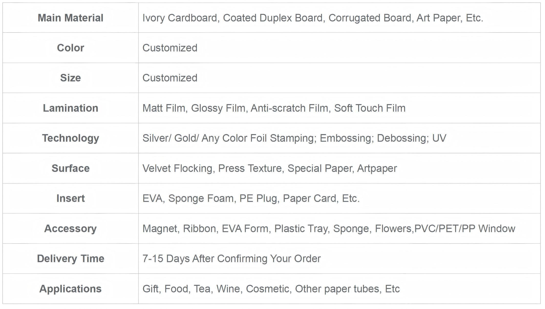 Industrial Use: Jewelry, Clothing, Cosmetics, Electronics, Gift packaging, etc.Printing Handling: Embossing, Glossy Lamination, Matt Lamination, Stamping, UV Coating, Varnishing,VANISHING